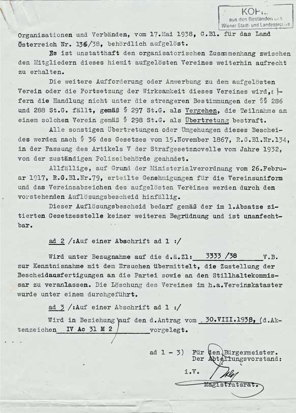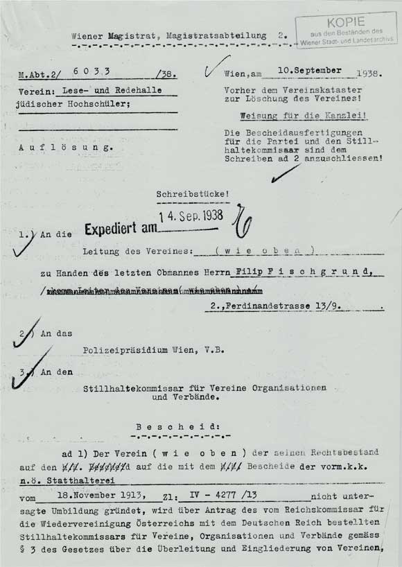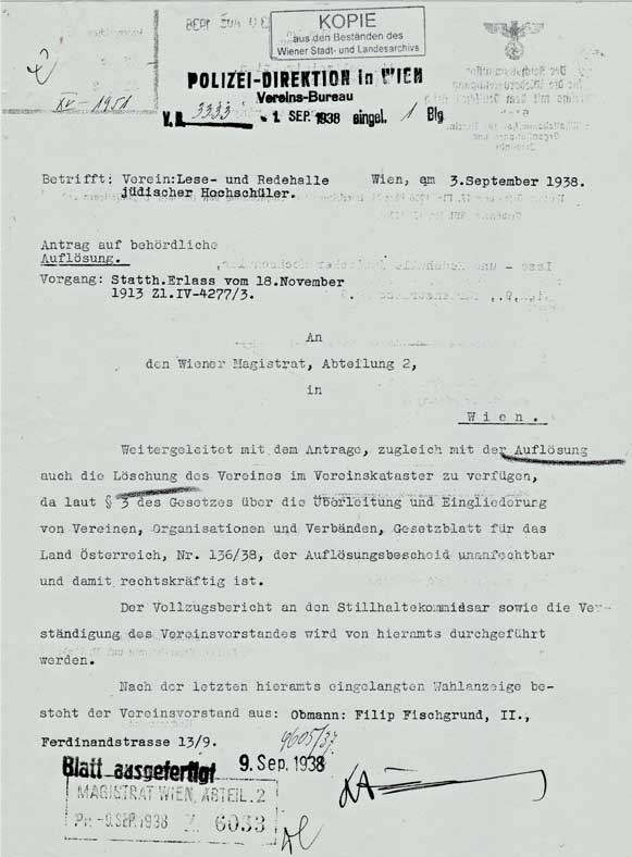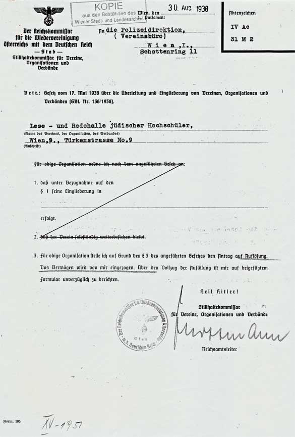 These document copies received from the Vienna Archives, provide—evidence of the dissolution of Die Lese-und Redehalle jüdischer Hochschüle in Wien (The Reading and Lecture Hall for Jewish University Students in Vienna) by the Viennese Nazi-authorities in August and September 1938. This Jewish academic organization and its dissolution by the Nazis are relevant to this website’s focus on the Jellinek family’s confrontation with the Holocaust because the forced closure and theft of this association’s library was one more psychological trauma that Karl Jellinek had to endure. Die Lese-und Redehalle jüdischer Hochschüle in Wien (hereinafter referred to as the “Halle”) had been central to Dr. Karl Jellinek’s life both before and after his presidency of the association during most or all of the years between 1923 and 1937. Karl’s brothers, Max and Siegfried Jellinek also participated in this organization. See Karl Jellinek’s Biography page and the photos in the Images section that show Karl at the ceremonial opening of Hebrew University in 1925, and at the “Halle’s” 35th anniversary celebration in 1929. The Austrian historian, Dr. Gregor Gatscher-Riedl, provided the information for the summary of the development of the “Halle” in the next paragraph. His 2019 historical article on the “Halle,” (which appears on this web page, below the four ‘dissolution’ documents) goes into greater depth and includes information on Karl Jellinek’s leadership. The “Halle,” chartered (under a slightly different name) by Ruben Bierer in 1894, played a major part in Jewish academic life in interwar Vienna, with a special emphasis on the Zionist movement. The purpose of this fraternity-like association, as stated in its 1913 statutes, was to support the community of Jewish students, as well astheir cultural aims and interests. Although Ruben Bierer’s original conception of the “Halle” was as an umbrella organization for the already existing Jewish academic ‘fraternities,’ the “Halle” turned into a students’ club with a library open for Jewish students both male and female. The “Halle” provided rooms for studies, as well as a vast selection of newspapers, mainly Jewish and especially Zionist. The “Halle” also had many interest-related departments, such as Hebrew and French languages, literature, sciences, music, sports, stenography, as well as aid for poor students, including rooms heated in the winter and affordable meals. The Nazi procedure of liquidation of Jewish organizations was always the same and had two main aspects: the closing and cessation of all activities and the seizure of the organization’s property on behalf of the Reich. Contrary to the (pre-Nazi) Austrian law that stipulated that the statutes of any private association (Verein) had to contain a paragraph concerning the dissolution concluded by its members, the dissolution of the “Halle” took place by German Nazi authorities and German “law.” This overarching Nazi ruling for the liquidation of associations can be seen at this link to the May 1938 Law Gazette for the Land of Austria, section #137: http://alex.onb.ac.at/cgi-content/alex?apm=0&aid=glo&datum=19380004&seite=00000403&zoom=2 The Nazis’ specific formal procedures to enact the “Halle’s” liquidation is revealed in these documents as follows: a.) Document dated August 30, 1938: Der Reichskommissar für die Wiedervereinigung Österreichs mit dem Deutschen Reich (the commissioner of the Empire for the reunion of Austria and the German Reich) commanded the dissolution of the association and the annexation of its possessions This decision was handed down for execution by the Polizei-Direktion, Wien (Police Headquarters in Vienna). b.) Document dated September 3, 1938: Polizei-Direktion is submitting the order for official deletion to the Vienna Magistrate in the Magistratsabteilung 2 (City of Vienna, Department 2., which had authority over religious and school affairs, associations, clubs, public charities and more. The official head of the association is identified by the Police as “Filip Fischgrund, (Vienna District II., Ferdinand Street 13/9)” c.) Document dated September 10, 1938: The Magistratsabteilung 2 (City of Vienna, Department 2.) is executing the order as follows: Deletion of the association in the register of associations via Bescheid (official juridical decision/order), communicated to Fischgrund. (CC: Reichskommissar and police headquarters) The official order states: The organization is dissolved. Any gatherings or even contact of its members among each other is prohibited. The wearing of the emblems, ribbons, pins, etc. is forbidden. Any infringement will be fined. Concerning the properties of the “Halle”: The vast library of the “Halle” was of special interest to the Nazis and brought after seizure to „Gauhaus“, the seat of „Reichskomissar“ in the former (and after 1945 to this day) Austrian Parliament. At least one volume could be found there in 2014 to be restituted to the Viennese Israelitsche Kultusgemeinde (the Jewish Community of Vienna). Another volume happened to surface in the library of Julius Streicher, Nazi-propagandist and Editor of the influential, rabidly anti-semitic newspaper „Stürmer“ in Nuremberg. The above comments are a compilation of paraphrased and quoted historical information, summaries, explanations and partial translations generously provided by Gregor Gatscher-Riedl, Ph.D., archivist in Perchtoldsdorf, Austria and by Andrew Simon, retired archivist in the Municpal and Provincial Archives of Vienna. Paulette Jellinek wrote the first paragraph and takes responsibility as well, for any inadvertent errors produced by her assembling and rewording of Dr. Gatscher-Riedl’s and Mr. Andrew Simon’s communications to me. Dr. Gregor Gatscher-Riedl’s article “An Intellectual Center for Viennese Jewish Students: The Reading and Lecture Hall for Je