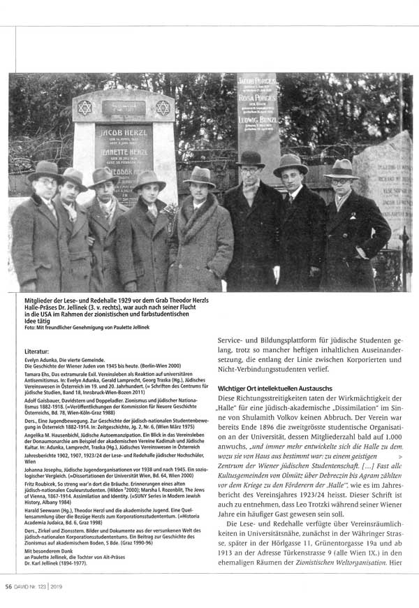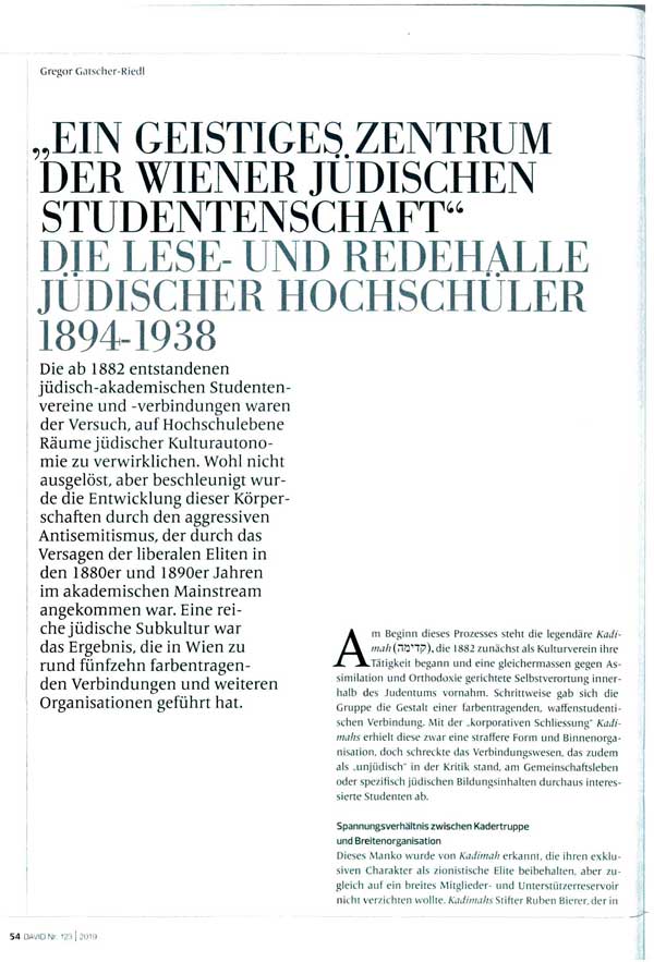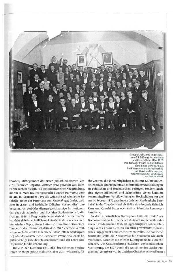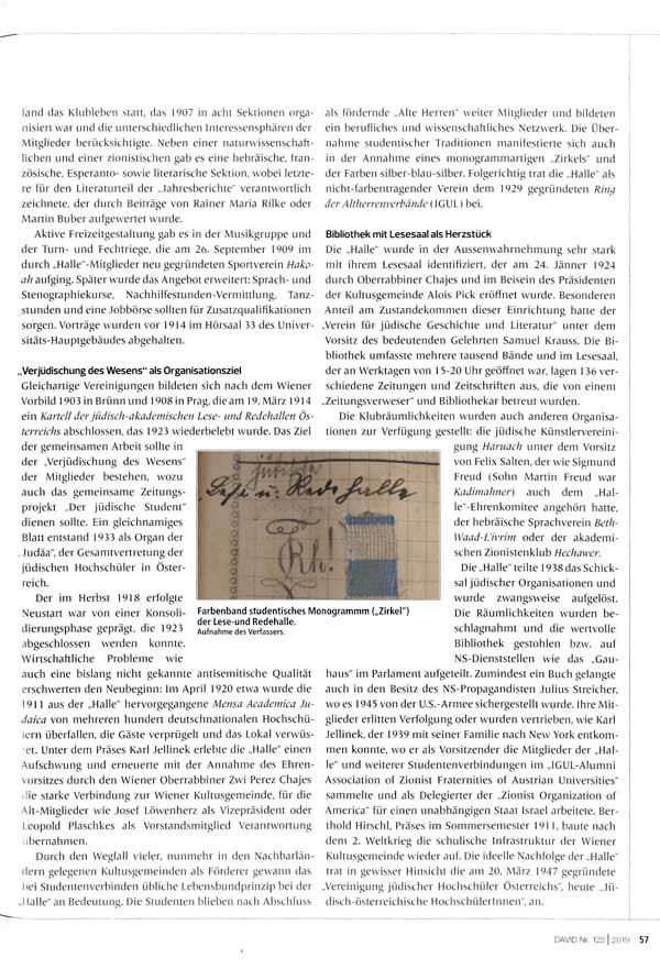 (“Circle”) of the Reading and Lecture Hall. “Raising Jewish awareness” as a goal of the organization2Associations modeled on the one in Vienna were formed in 1903 in Brünn and in 1908 in Prague, and on March 19, 1914 an Alliance of Jewish Academic Reading and Lecture Halls in Austria was finalized, that was revitalized in 1923. The goal of the joint work was to be “Raising Jewish Awareness” of its members, which goal was also to be served by the joint newspaper project “The Jewish Student.” A gazette with the same name was started in 1933 as an organ of the “Judäa”, the joint representation of Jewish university students in Austria. The new start in the fall of 1918 was characterized by a consolidation phase, which was finalized in 1923. Economic problems, as well as an unprecedented level of antisemitism, complicated the new beginning: In April 1920, for example, the Mensa Academica Judaica, that had emerged in 1911 from the “Hall,” was attacked by several hundred German- national university students; the guests [the Jewish students] were beaten up and the premises trashed.3 Under President Karl Jellinek, the “Hall” experienced a revival and with the acceptance of the honorary chairmanship by the Chief Rabbi of Vienna, Zwi Perez Chajes, it renewed the strong connection to the Viennese Jewish Community, for which long-time members, such as Josef Löwenherz as vice president or Leopold Plaschkes as a board member, assumed responsibility. There was a loss of sponsorship [for the “Hall”] by the many cultural communities that were now in neighboring countries [i.e., no longer in the same Austro -Hungarian Empire.] This loss increased the significance for the “Hall” [members] of the principle of a lifelong bond, a characteristic of student fraternities. After graduating, the students continued their membership as supportive “old boys” and formed a professional and academic network. The adoption of student traditions also manifested itself in the adoption of a monogrammed “Circle” and the colors silver-blue-silver. Consequently, the “Halle” joined the Ring der Altherrenverbände (IGUL) the association of former students, founded in 1929 as a non-color-identified association. Library with a reading room at the coreIn the public's perception the “Hall” was closely identified with its reading room, which had been opened on January 24, 1924 by Chief Rabbi Chajes, and with the President of the Jewish Community Alois Pick in attendance. A special role in the creation of this institution was played by the “Verein für jüdische Geschichte und Literatur” [Association for Jewish History and Literature] under the chairmanship of the prominent scholar Samuel Krauss. The library comprised several thousand volumes and the reading room, which was open from 3:00 pm to 8:00 pm on weekdays, offered 136 different newspapers and journals, in the care of a “newspaper administrator” and librarian. The club's premises were also made available to other organizations: the Jewish artists' cooperative Haruach [Hebrew: the spirit] chaired by Felix Salten who, like Sigmund Freud (his son Martin Freud was a member of Kadimah) was also a member of the “Hall's” honorary committee, the Hebrew language association Beth-Waad-L'ivrim [Hebrew: Committee for Hebrews] or the academic Zionists' club Hechawer [Hebrew: the comrade]. In 1938 the “Hall” shared the fate of Jewish organizations and was forcibly dissolved. The premises were seized and the valuable library stolen or distributed to National Socialist offices, such as the district office in Parliament. At least one book also came into the possession of the Nazi propagandist Julius Streicher, where it was secured in 1945 by the U.S. Army. Its members suffered persecution or were expelled, like Karl Jellinek, who in 1939, was able to escape to New York with his family where, as chairman, he gathered the members of the “Hall” and other student fraternities into the IGUL-Alumni Association of Zionist Fraternities of Austrian Universities and, as a delegate of the Zionist Organization of America, worked for an independent State of Israel. After the 2nd World War, Berthold Hirschl, the president during the 1911 summer semester, rebuilt the academic infrastructure of the Viennese community. In some respects the ideal successor to the “Hall” became the Vereinigung jüdischer Hochschüler Österreichs [Association of Jewish University Students in Austria] founded on March 20, 1947. Bibliography:Evelyn Adunka, Die vierte Gemeinde. Die Geschichte der Wiener Juden von 1945 bis heute. [The fourth community. The history of Viennese Jews from 1945 to today (Berlin-Vienna 2000) Tamara Ehs, Das extramurale Exil. Vereinsleben als Reaktion auf universitären Antisemitismus [The extramural exile. Life in clubs as a reaction to anti-Semitism in universities] . In: Evelyn Adunka, Gerald Lamprecht, Georg Traska (publ.), Jüdisches Vereinswesen in Österreich im 19. und 20. Jahrhundert [Jewish associations in Austria in the 19th and 20th century]. (= Writings from the Center for Jewish Studies, Volume 18, Innsbruck-Vienna-Bozen 2011) Adolf Gaisbauer, Davidstern und Doppeladler. Zionismus und jüdischer Nationalismus 1882-1918 [Star of David and imperial eagle. Zionism and Jewish nationalism 1882-1918]. (=Publications by the Commission for Modern Austrian History, Vol. 78, Vienna-Cologne-Graz 1988) Ibid., Eine Jugendbewegung. Zur Geschichte der jüdisch-nationalen Studentenbewegung in Österreich 1882-1914 [A youth movement. On the history of the Jewish national student movement in Austria 1882-1914] . In: Zeitgeschichte, Vol. 2, No. 6, (Vienna March 1975) Angelika M. Hausenbichl, Jüdische Autoemanzipation. Ein Blick in das Vereinsleben der Donaumonarchie am Beispiel der akademischen Vereine Kadimah und Jüdische Kultur [Jewish auto-emancipation. A look at the clubs of the Danubian Monarchy using the example of the academi
