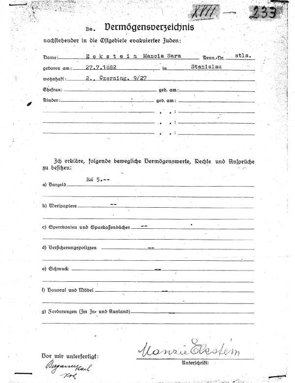 • "Kenn Nr." (abbreviation for Kennzahl Nummer - code or identification number). She could not have had Polish citizenship either, because from 1882, when Mathilde was born in Stanislau, Galicia, through the time of her departure for Vienna early in WWI, Galicia was a territory of the Austro-Hungarian Empire. Galicia would only become a part of an independent state of Poland after WWI. • Mathilde declared [only] 5 Reichsmarks in cash (“Bargeld - RM 5.--”), but no securities, blocked accounts, savings books, insurance policies, jewelry, household goods and furniture, or receivables [money owed to her] in the Third Reich or abroad.