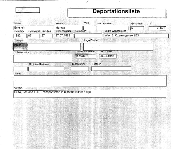 B) “Deportationsliste” (Deportation List) • This is the neat, typed Nazi record, complete with date, destination (Izbica) and the Transport Number’ (“17/233”, the same as in her Asset Declaration), of Mathilde’s forced deportation to her murder. • The imprinted rectangular space for Mathilde’s date of birth, last residence In Vienna, and her Identity number are filled out, but the boxes for Mathilde’s ultimate fate (Schicksal/Deplisten?] ), date of death (“Todesdatum”), place of death (“Todesort)”, concentration camp/enforced, segregated area for Jews (“Lager/Ghetto”), birthplace (“Geburtsort”) and maiden name (“Mächenname”), are left blank.