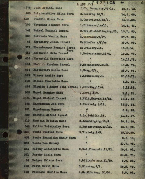 • The Nazis used the name Mancia or Manzie, and not the more German-sounding Mathilde, which is the name by which her four children knew her. • The name “Sara”, which was not Mathilde’s middle name, follows her first name. The addition of “Sara” was required to indicate that Mancia/Mathilde was Jewish. In August 1938, the Nazi regime had ordered that all Jews whose names were not recognizable as “Jewish” adopt the middle name of “Israel” (for Jewish men) or “Sara” (for Jewish women). • “XVII”, hand-written in the top-right area of this form, probably signifies that this 'transport’ was the 17th transport from Vienna. However, this was the first of the four deportation transports that evacuated 4000 Jewish men, women and children from Vienna's "Aspang" train station to Izbica, between April 9th and June 1942. “233” indicates that Mathilde/Mancia was the 233rd person on this particular transport.