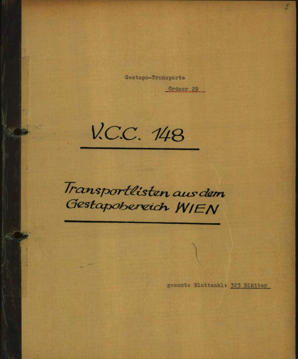 D) The cover page of this same list of deportees. • "V.C.C.148" is an older International Tracing Service Archives designation for "Transports from Vienna." "Transportlisten aus dem Gestapobereich Wien" means “Lists of transports run by the Secret State Police (Geheime Staatspolizei, known as Gestapo) of the Vienna area. "Ordiner 29" means file #29. The words on the bottom of this cover read: "gesamte Blattzahl: 323 Blätter" mean that there are a total of 47 pages in these lists.
