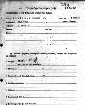 Primary Documents Hans Ranzenhofer’s Birth Certificate - Recorded and Certified by Siegmund Jellinek in Oberhollabrunn, 1934 Birth Record Books of the Jewish Community in Vienna, 1826 - 1938 and Erich Jellinek’s 1924 Birth Record Nazi-required Asset Inventory, Completed by Miron and Anna Jellinek Nadel - Vienna, April 1938 Dr. Karl Jellinek’s Post‐Anschluss Involvement in the Palestine Office of Vienna and the Zionist Regional Association for GermanAustria — and the Context for his Actions Correspondence Concerning US Affidavit and Visa for Karl Jellinek and Family Dissolution by the Nazis of the Reading and Lecture Hall for Jewish University Students in Vienna - August and September 1938 & 2020 DAVID magazine article on this association's history, vibrant intellectual and other activities from 1894 - 1938, by Gregor Gatscher-Riedl. The Nazi Regime’s Disbarment of Dr. Karl Jellinek & 1,824 Other Austrian Jewish Lawyers, September 1938 Letter from Karl Schreiner Confirming Takeover of Karl Jellinek’s Law Office - Vienna, November 1938 Karl Jellinek’s Passport out of Nazi-annexed Austria and into the United States, December 1938 - February 1939 Kreindel E. Jellinek’s and daughter, Michaela Jellinek’s Passport out of Nazi- annexed Austria and into the United States, January - February 1939 List of Jews, Including Siegfried Jellinek, Deported from Vienna to Nisko, October 20, 1939, and Related Cover Pages Mathilde/Mancia Eckstein’s Asset Declaration Required by the Nazi Regime Prior to Her Deportation, and Nazi Records of Her Deportation to Izbica, April 1942 Nazi and Post-war Records of Siegmund Jellinek’s Deportation to Theresienstadt, August 1942, and related original poem by granddaughter, PJ, 1998
