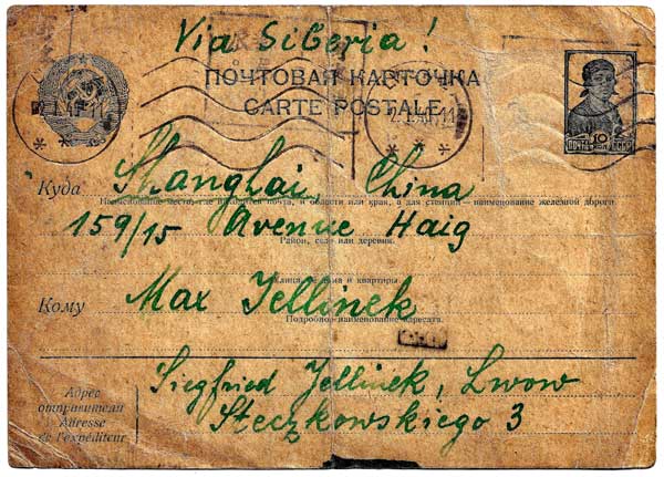 Siegfried’s message gives us a glimpse of the relative safety and well-being he seems to be experiencing in the formerly Polish city that had come under Soviet control a little more than two months earlier. The card provides evidence, that Siegfried was not only still alive in January 1940, but also, reportedly healthy and working as a woodworker to sustain himself. The rest of Siegfried’s message shows his longing to hear from and be heard from his deeply beloved brother and family. It is particularly remarkable that this postcard is extant, in that it travelled from a USSR- controlled Polish city, “Via Siberia,” to Shanghai, and that it eventually reached G. Nadja Jellinek in Mandate Palestine, who passed it on to me, P. Jellinek, in 1999! |
