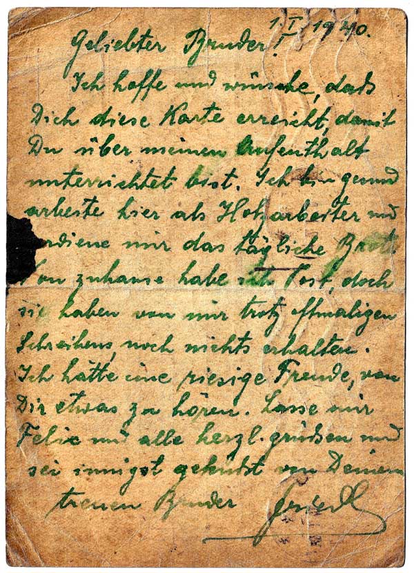 January 1, 1940 Beloved Brother! I hope and wish that this card reaches you so that you are informed about my stay.1 I am healthy and work here as a woodworker and earn my daily bread. I’ve received mail from home, but despite my repeated letters, they have not yet received anything from me. I would have immense joy to hear something from you. Please give Felix2 and everyone my heartfelt greetings and be most affectionately kissed by your faithful brother, Friederl3 |