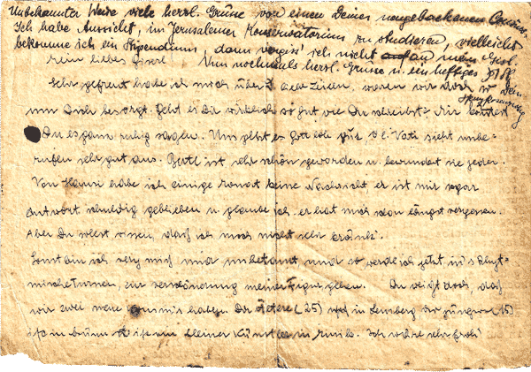And again, kindest regards and a strong Shalom1, Yours, Heinz Rosenzweig My dear Giserl! I was very happy to receive your dear lines, we were all worried about you. Are you really as well as you write? You could tell me [the truth] quite calmly, you know. We are all well, thank God; dear Daddy looks, touch wood, very good indeed. Bertl became very beautiful too and everyone admires her. I have not heard from Hansi for a couple of months; he still owes me a reply and I believe that he has long since forgotten me. But, you should know that I am not very hurt . Otherwise, I am [ ?ery mi??] and unemployed [?] and I will start doing rhythmic gymnastics now to improve my figure. You know that we have two new cousins. The older (25) lives in Lemberg, the younger in Brünn; he is a little artist in music. I would be very happy if you could get to know them all. |