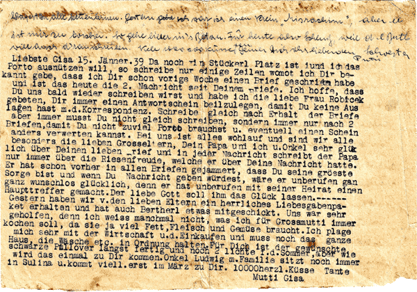 [Page 2.] Yesterday I went to the “Misrachim”2 association, but it is too koshe for me and I rather go to Betar.3 So that’s it for today, because dear Bertl also wants to write. Many 100,000 kisses from your dearly loving sister Putzi.4 Dearest Gisa, January 15, 19395 As there is still some space left and I want to use the postage, I am writing only a couple of lines to you to tell you that I have already written a letter last week; hence this is the second message since your last letter. I hope that you will write us again soon and today I asked dear Mrs. Robicek6 to always enclose a reply coupon so that you do not have any expenses with the correspondence. Answer right after receiving the letters, but not always only after you received the second letter, so that you won’t need too much postage and so that you may use one coupon for something else. We are all in good health and we all, especially the dear grandparents7, your father, I and uncle, were very happy to receive your dear letter; in every message your father only writes how happy he [is] to receive your message. In all letters before, he had been wailing that you are his greatest sorrow, and if only he could hear from you. he would be perfectly contented, for with his marraiage, he already won “first prize.” May God give him his happiness. — Yesterday we received a wonderful parcel with charitable gifts from the parents and also Bertherl sent something with it.8 This was very helpful for us, for I sometimes do not know what to cook for grandmother, as she needs much fat, meat and vegetables. I am struggling with the household, running errands, and in addition, I have to look after the house and the laundry, etc. The black pullover and two lighter ones for the summer, have long been ready for you, but how will this ever get to you? Uncle Ludwig and family are still in Sulina9 and they [will] come to see you perhaps only in March. 10,000 heartfelt kisses, Aunt Mom Gisa. |