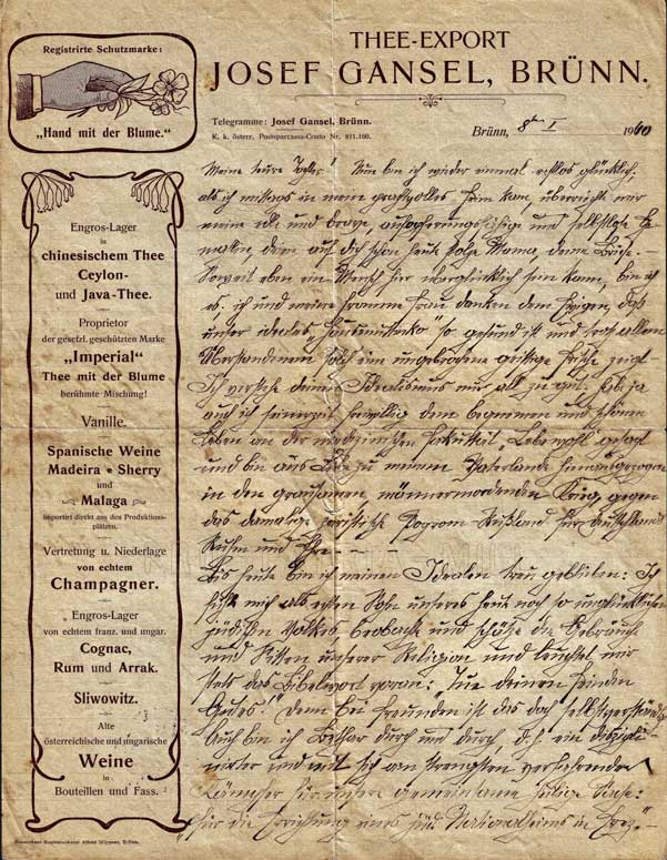 1. Hugo used the printed stationery of the tea export company of Josef Gansel. The company’s “registered trademark of a “Hand with the flower” appears in the top left corner and various teas and alcoholic drinks are listed along the entire left side. We do not know how Hugo obtained this stationery. One possibility is that the company was forcibly taken over from the Jewish man, J. Gansel, by a non‐Jew (“aryanized”) who changed the name of the company, and then, somehow, Fritzi or Hugo got this defunct stationery. It is also possible that Hugo briefly worked at this company.
