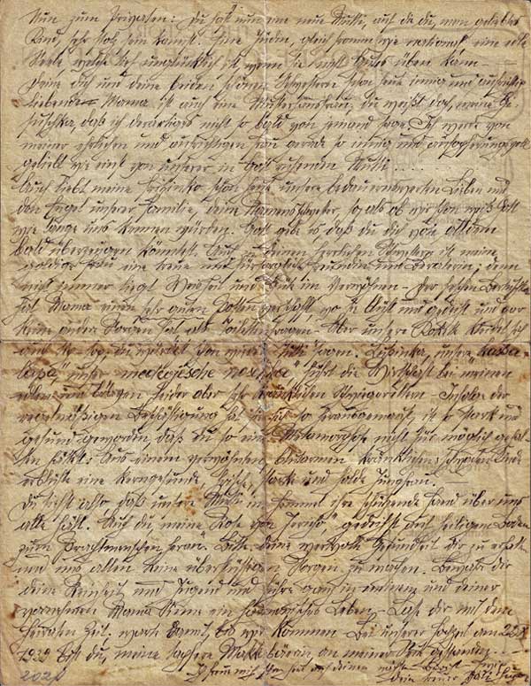 II. Now to private matters: You now have a new Mama of whom you, my beloved daughter, can be very proud. A Jewess, equally pious and nationalistic, an honest soul who is deeply unhappy when she cannot do good. A Mama who already deeply and sincerely loves you and your two beautiful sisters; is also a model housewife; you know, my Gisuschka, that I don’t say that of anyone so glibly. I am loved by my honest and upright wife, just as deeply and without demand like once from our Mama, may she rest with God. My Fritzinko [Fritzi] also already loves our pitiable love and angel of the family, your namesake, [Gisella Jellinek Schlesinger]4 as if we had already known each other God knows how long. God grant that you can convince yourself of everything soon. My dear wife is also a true and caring friend and advisor to your fine sisters, for pampering is not always the wise and benevolent path. ‐ Mama obtained a very good position for the fashionable Bertuschka, [Berta] where she thrives and blossoms and has no other worries except her toilette. But our coquette dresses herself also tip‐top; you would say yet again “idiot.”5 Lussinka, [Anna] our “pigeon‐toed, clumsy one,”6 our dear “methodical [?] daydreamer”7 keeps house for my noble, brave, but unfortunately, very sickly in‐laws. Due to the regular work, she has developed and is strong and healthy ‐ ‐ you wouldn’t believe such a metamorphosis could happen: from a spoilt, anemic, sickly and weak child, bloomed a healthy, fresh, strong and attractive young woman. You see that our Mama in heaven stretched her protective hand over all of us. You too, my “Rose of Jericho,”8 thrive on holy ground to be an exemplary being. Please maintain your precious health and don’t cause us any unnecessary worry.9 Preserve your purity and youth and lead, completely, as in my and your noble Mama’s understanding, a harmonious life. Wait to get married, wait until we come.10 At our wedding on the 22.X. 1939, you, my brave Maccabee, stood at my side. —