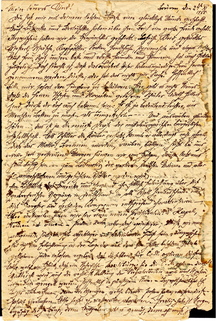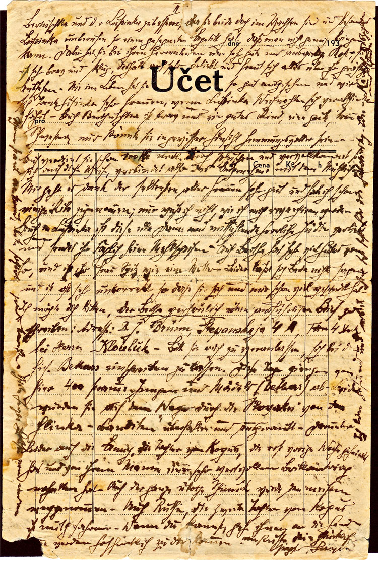 My precious child! Brünn, November 24, 1958 [sic]1 Your last letter caused me happiness. Lussinka and Bertuschka2 also had much joy from your letter. In the meantime, we sent what you requested: shoes, dress, a knitted vest, underwear, headrest, socks, gloves, pajama bottoms and something sweet. Also, Mrs. Spitz, our best and most precious friend and protector, also added chocolate, although I fear that this token from this amiable woman may be taken out, or should we even be worried about that? Hopefully! Please acknowledge receipt right away. Here there is nothing new. You might also be aware that the Czechs and Slovaks are docile students of Adolf Hitler's: It is significantly easier to make beasts out of humans than the other way around3 . . . . . and rob, plunder and kill. . . , that is the newest device of the middle-class citizens of middle-European society. When Schiller wrote: “Die Rauber,” [The Robbers], he could not have imagined that his lines “Burning, murdering, robbing, fighting — this is nothing more than a way for us to pass time; tomorrow we'll hang from the gallows; therefore live and be merry today ...” would become the leitmotif of the brutalized German nations and all of their annexed and occupied peoples . . . . . . . It is a gleam of hope that America and England broadcast their ethical indignation about these criminal happenings in Germany — to shout out to the whole world and appropriately characterize these gangsters and various companions. — But meanwhile, we have a new president, Dr. Hagel. Nomen est omen4 — pardon: Hacha, would be more appropriate; he is supposed to be, it is said, a very objective and important jurist. Meanwhile there is an easing of the situation of the Jews who fled Hitler-occupied territory, in that they can opt for C. Sl. [Czechoslovakia]. What luck that a Czech citizen can opt for the C. Sl !? Perhaps the legal status of repatriates, [the group] to which I also belong, could somehow be settled, hopefully in a favorable way!5 In the meantime, nothing can be done, for the few that already held such positions had to give them up immediately.6 So it means waiting for the time being. Of course, I worry about the future, the expenses are enough, as I must support [next page] II. She never looked so well and Aunt Gisinka8 would be so happy if Lussinka would travel there for Christmas. Bertuschka is also obedient and a good child, a good true sister; only she could be more restrained in certain ways. She also already earns 100 Crowns9 monthly by moonlighting and improves herself in this way, combining the pleasant with the useful. I am very well, thanks to the extraordinariness of all the women, and I have gained several kilos. Only I don't know how I can reciprocate. Also, this honorable lady and sympathetic, wonderful Jewess is in love with Lussinka and sends her daily delicious cooked desserts. Bertha also receives very good things from her and Mrs. Spitz is like a mother to her. Unfortunately, Berta does not listen to reason and is often very wrong, so that she has already harmed herself and me a lot.10 I want to beg you to write a personal, detailed letter to Bertha: Address: B.J. Brünn, Stepanskaja 4a, fourth floor, c/o Mr. Klonbuk. Please also ask and encourage her to register with the local Bethar. These days 400 religious boys and girls (Bethar members) left. Unfortunately, on the way through Slovakia, they were attacked and robbed by Hlinka- bandits;11 unfortunately, among them was Anny, the daughter of Kogus, who only last week got married and had received a very expensive engagement ring from her husband. All the other jewelry was stolen from most of them. Also Ruthie, the second daughter of Kogus, went with her. If you can, help them out; hopefully they will come to you. Many kisses, your doting Papsi, Hugo [p. 2, left margin]: If Paul arrives, please report it immediately. Many warm greetings from the others. [p. 2 right margin]: I am well and work very hard here for the Jabotinsky idea - struggle for numbers12 and for peace. |
