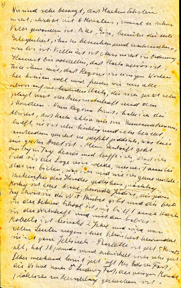 3) We are very worried that Markus Eckstein2 has not written in six months, especially as he became a father. Please Gisa, try at the first opportunity to visit him and find out what is wrong. Maybe something is not right. You can imagine that Karla is nervous. Tell him that Regina3 will be coming here in several weeks and we are all happy, especially Karla, who is working hard now with the housework and the three children. When Regina comes, I have the intention that Karla will help me with the insurance business. She [Karla] is very accomplished and very popular, apart from the fact that she speaks perfect Yiddish, which is a great asset here. My business improves from day to day and I hope that I’ll soon be able to offer my family what I would like and in the way that I would like. Thank God4, the children are developing wonderfully. Micky5 is a good conscientious Jewess, who puts something in the N. F. [Jewish National Fund - Israeli charity ] box every day, and is the best one in the Hebrew school and [also] helps Karla with the housework and the babies. Roberta is almost two years old and is admired by everybody for her beauty; she is a true Jellinek. Paulette is now five months old, weighs 16 pounds and is developing very nicely. Mrs. Edith Fast, widow of our Dr. Ludwig Fast, who died suddenly of a heart attack last month, comes often now; [usually] every weekend. |