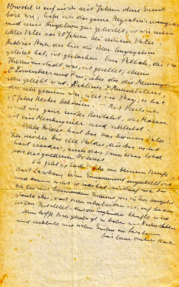 Although he6 was mad at me for years without cause, I arranged his entire burial and consoled his relatives, just like my noble father did twenty years ago for his father. Rabbi Bach, who led the Austrian congregation, died. Erna Petlak, who was in Theresienstadt, survived, as did Dr. Löwenherz and his wife; there are some doubts about them7. Rabbi Dr. Himmelstein, who was very mean, is jailed in Prague; he got fifteen years in strict confinement. - With Bertisch8, we are completely without contact; the man is crazy and bad. What pictures [photos] do you have of your father? I would like to send you all the pictures that you don’t have, as well as the family picture of the Golden Wedding anniversary.9 How are you? I see by your letter that Lasikam10 is employed in the goverment and so isn’t allowed to be as radical as you. I read with burning interest what is happening in Erez,11 but I believe that much is exaggerated on both sides.12 But one thing is certain, the British are scoundrels. Now, hoping to have soothed you with news, I remain with many greetings to Lasikam, Your devoted Uncle Karl |