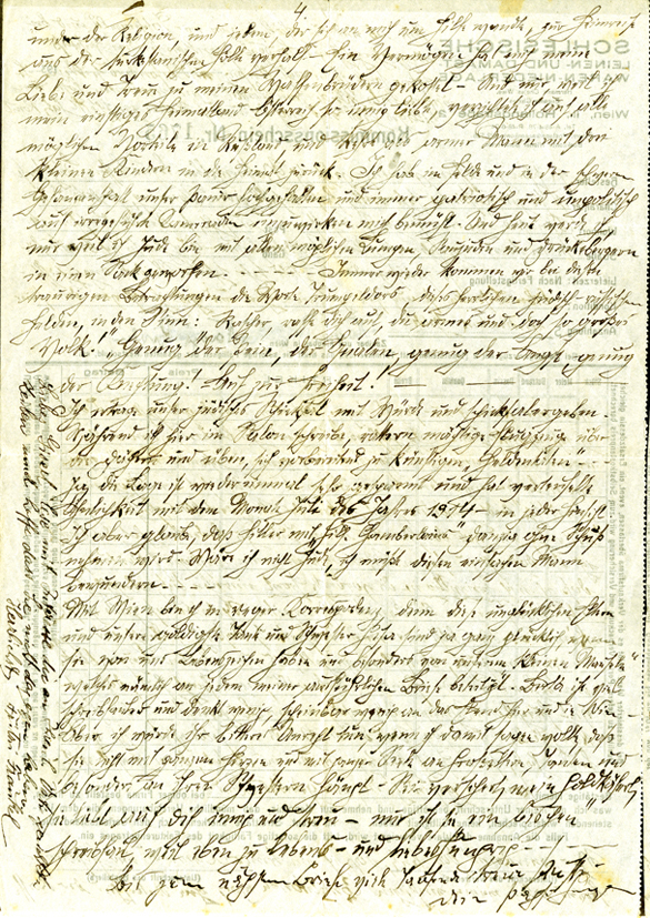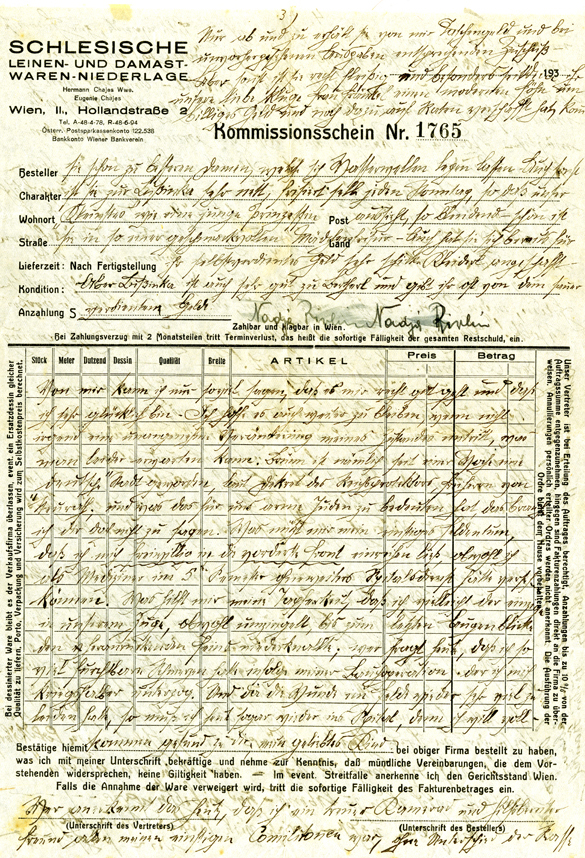 Continuation Certainly the future is shrouded with impenetrable, black cloths and one cannot envisage anything with certainty, but this noble and genteel woman, this good Jewess and Zionist, this industrious, hard-working housewife, admired for her art in the kitchen and in banking as well as for her talent as a seamstress; this rare benefactress and caring maternal heart; this woman with her social nature and sweet buoyancy; this jewel I never want to lose. – It is a pity that you cannot cast your eye about this magnificent apartment; this marvelous kitchen; this modern, famously appointed bath; this balcony on the second floor with the view to the most beautiful park in Brünn, the Winterholler Square, or as it was called previously, the Square of the 28th of October, (the founding day of the Republic); in this laundry alcove, even this is a reflection of the good homemaker; if you could be here with us, in our midst, watched over by this genteel and very smart woman, certainly everything here would be to your liking and you would likely be loathe to leave your new mother and faithful father to go back to the place that draws you so mightily.