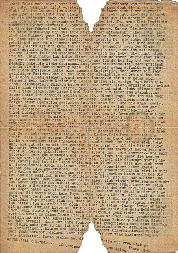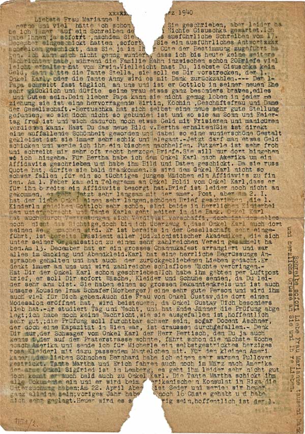 xxxxx March 19401 Dear Mrs. Marianne!2 I would have liked to write to you in great detail earlier, but unfortunately, I kept waiting for a letter from dear niece Gisushka.3 As you know, I immediately sent a long and detailed reply to the long letter from December 17, which you were so kind to send me. I cannot stop wondering why I haven’t received any further news yet, whereas the Hahn family received some 20 letters from Erwin. Maybe you, dearest Gisushka, do not have any money; if so, please ask aunt Stella for some; dear uncle Karl or aunt Anny will gratefully pay her back.4 Dear Dad5 drops us a line almost every day, and thank God he is very happy in his new marriage and his wife is a very good and fine person. Your father cannot praise her enough; in every respect she is a good hostess, cook, business woman and lady of society. - Bertuschka6 found a new and very good position for herself, where she does not have to feel committed all the time and in which she is free on Sundays and holidays. Now she is able to earn some additional money doing hairdressing and manicuring. Have you received the new pictures of Bertha? She has become an exceptional beauty with a wonderful figure, and she always dresses very nicely and elegantly. Now it is possible to send some money, and I will support her a little bit. Putzerle7 is very happy and she often writes sweet letters to me. She only wants to go where I am going. I asked uncle Karl [Jellinek] in America for an affidavit for Bertha and I sent him a picture with particulars. She should be able to go soon because she is eligible under the Russian quota.8 It should not be difficult for uncle Karl to obtain an affidavit for such a hard-working young girl. On February 1st, we received a telegram from uncle Karl to uncle Poldi, stating that he has already obtained an affidavit for Poldi. Unfortunately, the letter has not arrived yet, because the American mail is very slow, but on January 2, the dear uncle [Karl J.] wrote a very nice and detailed letter; the dear children9 are developing very well, thank God. They are being cared for in a wonderful day nursery10 and Karla can go on working at the bank. Uncle Karl made some money by standing in for someone. All this is not the right thing yet, but I am sure that he [Karl] is going to make his way. Karl is already very well established in society; [he] is already the president of of a large association that he organized, of Jewish Zionist academics.11 On December 13, he arranged a big Hanukkah festival, for which everyone had to wear a tuxedo or an evening dress.12 Karl gave a wonderful welcome speech in which he also mentioned his beloved one left behind in Europe. He always remembers us, and he is probably spending numerous sleepless nights. Has uncle Karl already written to you? In an airmail letter, I asked him to send you linen, clothing and shoes immediately, because you are unfortunately very poor. They have such a huge circle of friends, and our cousin, Irma Schafer (Morberger)13 is such a good person, so she probably gives him a lot for you too. Also, uncle Gustav’s wife, [= Gustav Jellinek and wife, Grete Jellinek] who opened a fashion house there, is certainly going to contribute; uncle Gustav loves you very much. He has been studying day and night, and towards the end of January he took his [English language medical] exam. I haven’t received any news yet about how it turned out; very good, I hope. This exam is supposed to be terribly difficult; even assistant professor Aschner failed the exam there, although he used to be a leading authority in his field in Vienna. Imagine, uncle Karl’s brother-in-law, Mr. Bertisch,14 whom you know and who used to live in Prater Street, is already going to America next week, and I am going to give him a sweet pink dress with a little matching coat, that I knitted for Micherle.15 For the little American, the dear little son, Bernhard, I knitted a very warm sweater. Aunt Martha and Erich are still going to America in March; poor uncle Sigfried [sic] is not feeling well at all in Lemberg, but he will also join uncle Karl soon.16 Aunt Martha is sending him all the necessary documents and he is going to have his medical check-up at the American consulate in Riga. This year’s Seder will be on April 22, and this year we will be all alone. Last year I still had 16 guests and I worked very hard. This year we will be very lonesome; hopefully, dear [written on the right edge of the first page] Write Immediately Dear Mrs. Marianne, a thousand thanks and kindest regards to you and your loved ones. [Also note in the lower left corner of page 1.: the censor’s marks consisting of the stamped numeral “1154,” followed by the handwritten ”/2.” [Page 2.] uncle Poldi will still be around; I cannot imagine being separated from my good, brave husband and I cannot