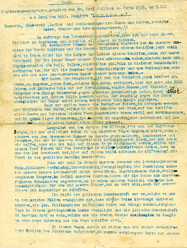 Copy Welcoming speech by Dr. Kal Jellinek on Purim 1939, March 5, on board the Dutch steamer "Vendoom"1 Chaverim, Chaverot,2 Ladies and Gentlemen, venerated guests, brothers and comrades in fate!! On behalf of the organizing committee, I have the high honor to greet and cordially welcome you.