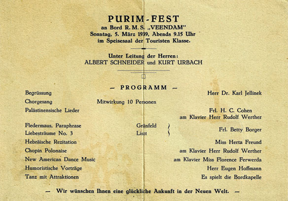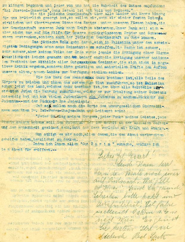 Karl Jellinek’s impassioned speech opening a Purim celebration held on board a ship to the US from Holland. Karl expresses strong belief in the eventual rescue of all of his relatives and of all persecuted Jews in Europe, and in the need for unity and cooperation of all Jews in the building of the Jewish homeland in British Mandate Palestine. Hand-written greetings were added after the text of Karl’s speech, by Hugo’s friend, 'Resl' Spitz. |