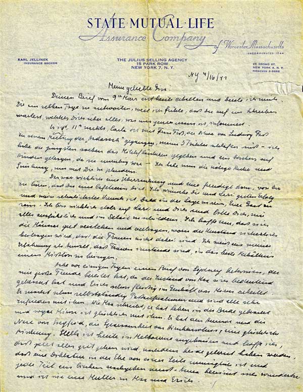 Handwritten by Karl Jellinek on his insurance business stationery, which identified him as “Insurance Broker,” with the State Mutual Life Assurance Company’s Julius Selling Agency in downtown New York City.