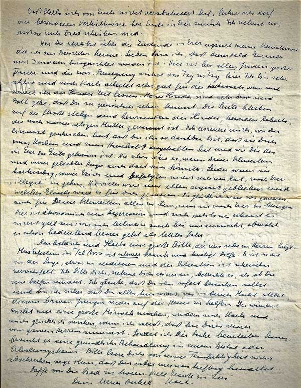 I would ascribe the fact that Stella did not say good-bye to you to the unusual circumstances with you being in Erez8. I assume that she will write to you soon. What you write about conditions in Erez9 supplements my knowledge that I have obtained from reports. Right now I heard that this hero Gruner10 has been executed with three others. Here with all Jews, there is great mourning and the Zionist movement grows day by day. I am very active and Karla too works very well for Hadassah, whenever and as far as the children afford her time. My children are very well-behaved and with God’s help, I hope that you will see them personally. People stop in the street and admire the children, especially Roberta, who is named after my late mother. I remember that you once wrote that you are so thankful to her that she encouraged you to cook and do housework and how that has benefitted you in Erez. How wonderful it would be if your sisters and our beloved Hugo could also be there with you. Unfortunately, like Erich, they were stubborn and did not follow my advice to go to Erez “illegally.” How much it would have spared us all and what good fortune it would have been for you.11 How happy I would have been to do everything for your sisters as well, to bring them to Erez. Here we have an economic depression and also politically, it doesn’t look good, which also partly affects me, although it is already significantly better than last year. Now I and Karla have a big appeal which is close to my heart. Max Eckstein12 in Tel Aviv is seriously ill and needs help. He is not in a position to earn anything and the situation is apparently desperate. I beg you to minister to him; consider it as if you are helping me. I believe that you should visit him right away and I am sure that you will do everything in your power to help this brave young man to get on his feet again. It wouldn’t be only a great Mitzvah, but it would make Karla and me happy if I knew that you do it wholeheartedly. As far as I can judge the situation, he needs thorough treatment in a hospital or rehabilitation home. Please don’t be discouraged by his delicacy of feeling, tell him that you act on my behalf. I hope to hear from you soon. Best regards13 to Lazi. Your devoted Uncle Karl |