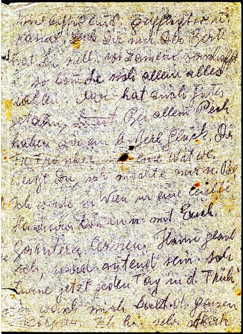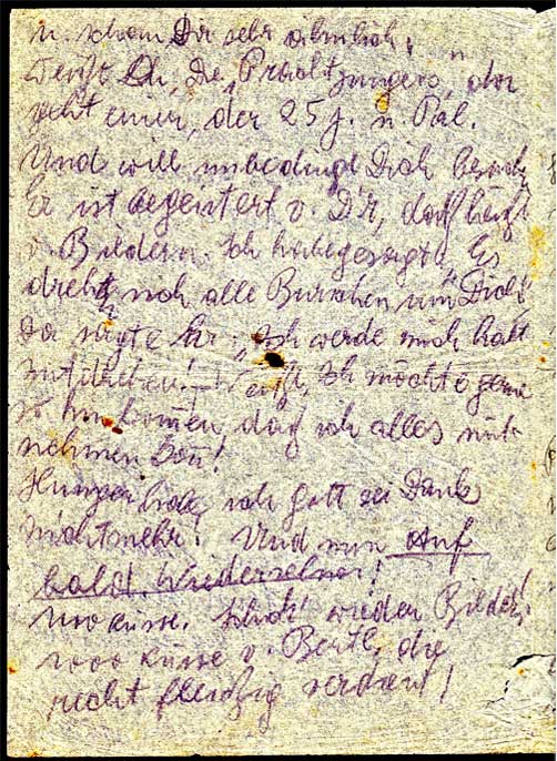 Sixteen year-old Anna writes with optimism and excitement about her and her cousin Erich’s prospects of getting to Palestine and reuniting with Gisella Nadja there. Anna also writes of the positive effects on the family of her father’s new relationship with the generous, sophisticated Mrs. Fränkel. The reader of Anna’s letter, who knows about the 1942 Nazi murders of Anna, her sister, Berta, her father, Hugo, and Mrs. Fränkel, will also find all of the other statements in Anna’s letter heartbreakingly poignant, including her statements of pride about her getting used to her work as a maid, her newfound strength and appearance and her thanking God for not being hungry anymore. |