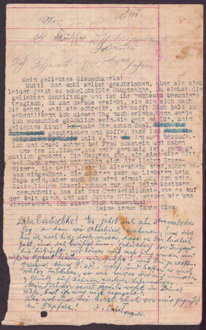 Dear Gisuschka! It is close to the third anniversary of the day that we said good-bye, and I am still here, but [we] know that you are doing well enough and that calms us. Of course, the future belongs to the young; we can’t be young again and would have to work like before – as you certainly know. We are healthy, thank God, and hope to remain so, and we wish you the same, as well as luck on your future life path. --- My brother and his family live close to you, haven't you run into him yet? Farewell and heartfelt greetings from me as well, you brave one! Your Uncle Leopold [next page] Dearest Giserl! [followed by Hebrew: letters, hand-written from right to left: Ayin, Mem and Shin]3 I hasten to send you my grandfatherly love and affection. I will tell you in this way since other means, unfortunately, cannot bring us closer, I use my writing to convey all my best wishes and to let you know that we are at the Old-Age Home XIX, Dolding Hohe Warte 32, but in spirit I am with you. I see your image before my eyes and hug you and kiss you with all my heart and remain with special love, your faithful Grandpapa.