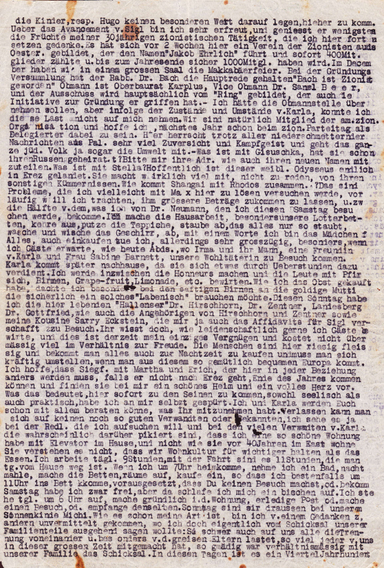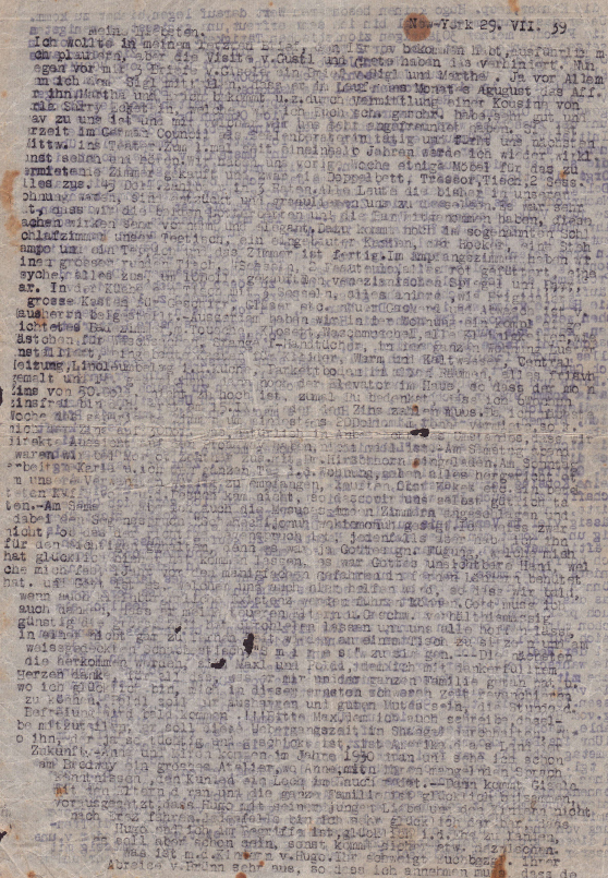 New York, July 29, 1939 In my last letter to you, which you surely received, I wanted to chat about myself in detail, but Gustl and Grete’s visit got in the way of that.1 Now three letters from Gisela are in front of me, as well as one letter from Sigl2 and Martha. First of all, I want to inform Sigl that in the course of this month, August, he will receive the affidavit for him, Martha and Erich, through the arrangement of a cousin of Karla’s, Sarry Eckstein, who, as I have already written to you, is very good and pleasant to us and with whom we have become very good friends. She is employed at the German Council as a counselor, and she will take us to the theater next Wednesday. For the first time in one and a half years, I will really see and hear something artistic again. Last week we bought some furniture for the room to be rented out, that is a double bed, a wardrobe, a table, two armchairs -- all that for $45 to be paid in three installments. So far, everyone who has been in our apartment was delighted and congratulated us on it. It was very good that we took the two daybeds and the bar3 with us; these items look very high-class and elegant. In addition, in our so-called bedroom, is our tea table, a built-in-cabinet, a stool, a standing lamp and a carpet, and the room is complete. In the foyer, we have a big round table, four chairs, two easy chairs, everything upholstered in red, a real bargain. [Yiddish: metzyeh] Altogether, everything was bought for $10. The Venetian mirror and a pair of [ . .?. . ]. In the kitchen, a table with three arm chairs; everything else, such as the refrigerator, a big closet for dishes, glasses, etc., new gas stove and sink for dishwashing is contributed by our landlord. In addition, our apartment has a complete, well-outfitted bathroom with a shower, toilet, washbasin, and all the little things such as a small cabinet for toiletries and a railing for towels. There are chandeliers installed throughout the apartment, built-in closets for clothes, hot and cold water, central heating, linoleum in our kitchen, parquet floors in all [other] rooms, everything freshly painted and decorated; and then there is an elevator in the building, so that the monthly rent of $50 is not as high as you may think, considering that I won’t have to pay rent for six weeks. That means that until September 15th, I don’t have to pay rent.4 As I plan to rent out the room next week for at least $20, that [effectively] reduces the rent to $30. Considering the fact that we have a direct view of Broadway, it is not a lot. On Saturday night, we were invited to Margot Zentner together with Dr. Hirschhorn. On Sunday, Karla and I worked the whole day in the apartment to arrange everything in order to welcome our relatives honorably; bought fruit, cakes, etc., prepared coffee and were ready, but the guests did not come. So we treated ourselves. On Saturday I also attached the Mezuzahs in our rooms and recited the “shecheyanuh ve higiyanuh” blessing.5 I really don’t know if that is the right blessing; anyway I assumed that was the right one because it is by God’s grace that He let me come here happily; it was God’s invisible hand that for nearly a year has sheltered me from manifold dangers in distant countries, and it is God who will also help us here so that we can soon lead a middle class existence. I must also thank God that he allowed my dear parents and my siblings to live through the whole time with relative ease, and allows us all to hope that in the not too distant time, we will sit at one table and sing “Smires.”6 at a Sabbath table with a white table cloth. - - - [next page] children, as well as Hugo, don’t consider it that important to come here. I am very happy about Sigl’s advancement; at least he is reaping the rewards of my thirty years of Zionist activities that I hope to continue here. Two weeks ago, a chapter of Zionists from Austria organized here under the name of “Jacob Ehrlich” and counted 400 members right away and surely will have 1,000 members by the end of the year. In December, we will have the Maccabee celebration in a large hall. At the founding, the Rabbi, Dr. Bach, was the main speaker: “Bach Became Zionist.” The chairman is senior board member Karplus; vice-chairman, Dr. Sanel Beer, and the remainder will be formed mainly by the “Ring”,7 who also provided the initiative for the establishment. I should have taken the chairmanship, but in view of the circumstances and Karla’s condition,8 I could not take such a burden upon myself. We are, of course, members of the American Zionist Organization and I hope that next year I will be at the Zionist Party Convention as a delegate. Here, despite the depressing news from Palestine, prevails a spirit of support and fighting mood for the whole Jewish world. - How is Gisuschka?9 Has she already married her Russian? Please let me know her address as well as her new name. What’s happening with Stella?10 Hopefully this female Odysseus has at last landed in Erez. She is really going through a lot, not to mention her usual troubles. How does Shanghai get together with Rhodes? Those are problems that I might try to solve with Max here; in the meantime, I will try to send him more money, for example, half of what I get from Dr. Neumann, whom I will visit this Saturday. I do the housework, especially our couches, sweep, clean the rugs, dust all the things that get so dusty, wash and wipe the dishes; in one word, I am the maid for everything. I even go shopping, so to say, very generously, especially when I expect guests like tonight, when Irma and her husband, a girlfriend of Karla’s and Mrs. Sabine Barnett, our benefactor, come to visit. Karla is coming home later, as she earns something extra for overtime. I will do the honors in the meantime and provide the people with peaches, pears, grapefruit and lemonade. When I bought the fruit, especially the juicy pears, I thought of sweet 