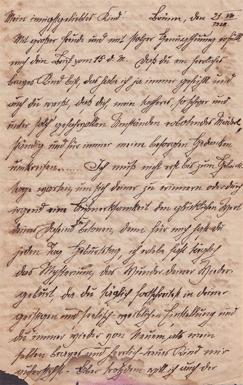 Brünn, August 21, 1938 Your letter dated the 15th of this month fills me with great pleasure and proud satisfaction. I have always felt that you are a wonderful and good child, and you know too that my anxious thoughts constantly and forever revolve around you, my brave and hardworking girl, who is working under such dangerous and difficult conditions........ I don’t have to wait until your birthday to remember you, or, by means of some token of my attention, to emphasize how much happiness your existence gives me, because as far as I am concerned, every day is your birthday; almost every day I experience the mystery, the miracle of your rebirth, as you develop further each day in your spiritual and emotional-feminine attitude while you, my exceptionally well-behaved and splendidly loyal child, rise for me time and again - But nevertheless, I also want to fulfill the