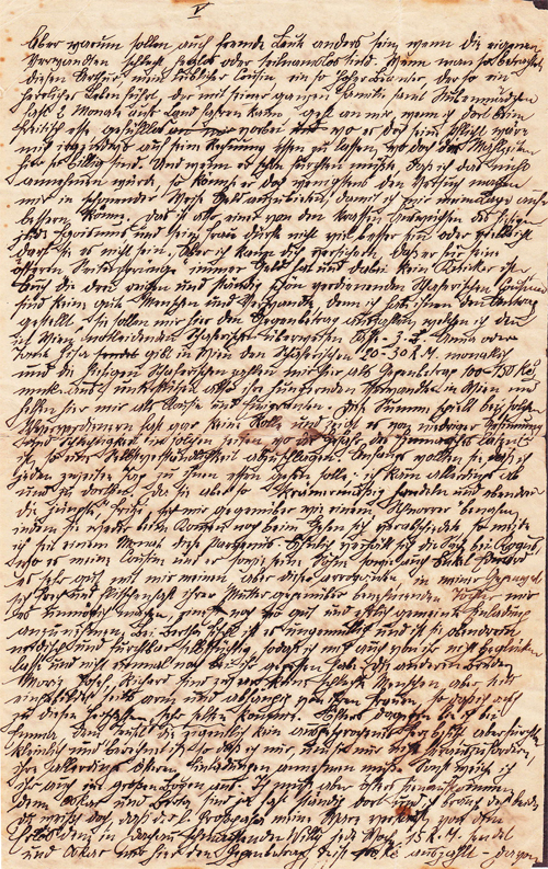 V. But why should strangers be any different, if even one’s own relatives are bad, heartless and indifferent? If you consider this Arthur, my natural cousin,9 such a high [bank] official who leads such a wonderful life, who can go to the countryside for almost two months with his entire family and his housemaid, who walks past me whenever I sit there at the free table without showing any emotion, even though it would be his duty to have me eat on his account some time, given how cheap the meals are here. And should he worry that I would not accept [his invitation], he could at least try and offer me some money in a gentle, considerate way to help me improve my situation. This is one of the extreme examples of the local Jews’ egotism, and his wife doesn’t seem to be any better, or perhaps she is not allowed to be. But I can assure you that he always has money for his frequent infidelities; he’s not stingy with that. Also, the three rich and continuously well-earning Schafer cousins10 are not good human beings and relatives; I have asked them to pay me the amount which I paid to the needy Schafers in Vienna; for example, Anna or Aunt Gisa give 20 - 30 Reichsmark per month to the Schafers in Vienna, and the Schafers here pay me the equivalent sum of 100 - 150 Kronen per month, thus supporting their starving relatives in Vienna and helping me here as their cousin and an emigrant. To such well-off people, such an amount does not make a difference, and it is a sign of a low-grade mind and wickedness to refuse such a self-evident matter while the danger of an invasion is latent. Initially, they wanted me to come over for a meal every other day; however, I go there every now and then. But because they behave in such a small-minded way and, above all, their youngest daughter, Fritzie, was treating me like a scrounger, by not greeting me neither when I came nor when I left, I have been avoiding these parvenus for a month. There is a similar situation at the Rogus’ place, where my cousin, as well as his sons and Uncle Eduard, mean well towards me, but this arrogant daughter, who behaves brazenly and like a tart towards her mother in my presence, makes it impossible for me to accept an invitation, no matter how honest and well-intentioned.