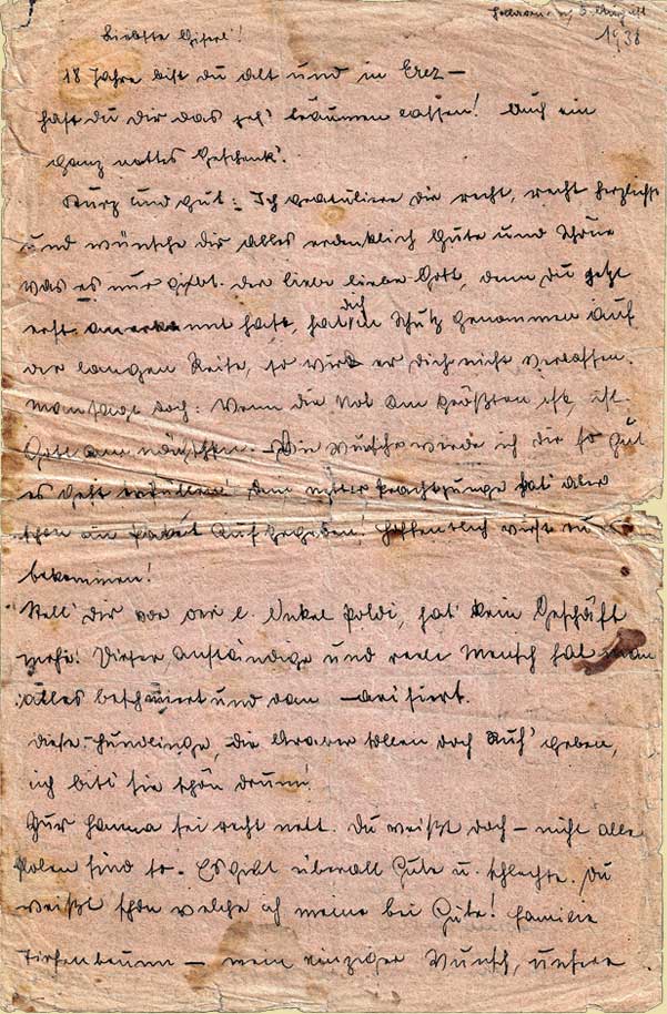 Hollabrunn, August 5, Dearest Giserl!1938 You are 18 years old and you are in Erez – In short: I congratulate you very heartily and wish you everything imaginable that is good and wonderful. The loving, dear God, which now you have acknowledged, protected you on the long journey, so He won’t leave you. As they say: When the need is greatest, God is nearest. The wishes I’ll try as best I can to fulfill. Your nice, splendid boy has already sent a package; I hope you’ll get it! Just imagine, dear Uncle Poldi no longer has his shop! People besmeared everything belonging to that honest and genuine human being and then aryanized it.1 These scoundrels, the Arabs should really give [everyone] peace and quiet already, I beg them for that!2 Be especially nice to Hanna. You know, don’t you — not all Poles are like that. Everywhere good and bad people exist. You must know already which good people I mean! Family Tiefenbaum – I only wished our [page 2. ‐ reverse side] family was like that! I enjoyed every day with them; such hospitality like nowhere in the world. Gieserl, write directly to the family Tiefenbaum. Dear aunt Anny will enclose the stamps. It must be hot there, no?! Here it is 33° in the shade. It’s a pain.! I am melting already. ‐ I’ll send you the picture that you wanted from Leipzig. Please write to dear Fuchsi.3 She should send you the picture of [ . . ? . . ] (Daddy has them also). The (dear, dear) 5 feet 5 [times] power grandmamá (stressing the second syllable)! praises you. If I go away, she’ll also praise me; right now, she does the opposite.