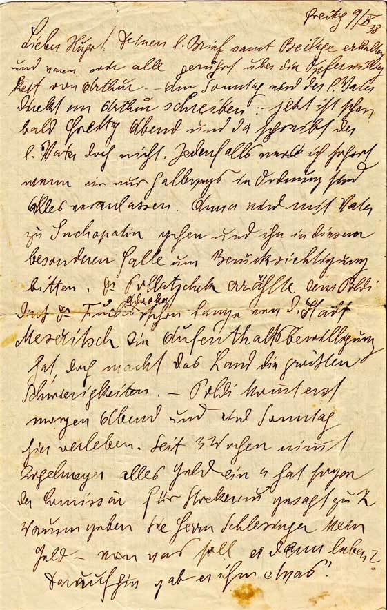 Friday, September 9, 1938 Dear Hugo/: We received your dear letter and enclosures and were all touched by Arthur’s1 sacrifice. Our dear father will write to Arthur directly on Sunday. It is already nearly Friday evening and at this time our dear father does not write. In any case, I’ll arrange it all if we are only halfway in order. Anna will go with father to an idiopathic [doctor] and beg him to have consideration for this special case. Dr. Polatzchek told Poldi2 that Dr. Fuchs [Oldrohn3 ?] has had for a while already, the residence permit from the town of Meseritsch4, although the country makes certain difficulties. - Poldi will come only tomorrow evening and will stay here Sunday. For three weeks, Ingelmeyer has taken all the money and even the commissioner from Stockerau has said to Z., [ ? ] why don’t you give Mr. Schlesinger any money — what can he live on? Therefore he gave him something!5 [next page] |