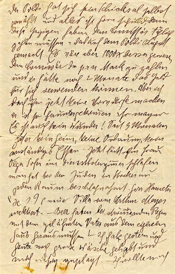 Poldi chose his own fate and all is his fault because these cheapskates had to pay the commissioner daily and therefore made Poldi afraid. But it would have been a thousand times better to pay the commissioner these few Marks and he could have used the money for himself for two more months. But I am not allowed to reprimand him; he is so worn down and thin. It is also no wonder! For three months he had no home, no order, no proper food. Now, Mrs. Olga Sofer lets him sleep in the servant quarters. In Stockerau, every room was confiscated from the Jews. Mr. Hameter, the bastard,6 took possession of Arthur Meyer’s new villa for himself. — In pouring rain, the Beers had to get out of their own house, with their paralyzed father! — Yesterday and today, I had a lot of wash and worked very hard. I wanted to still [next page] |