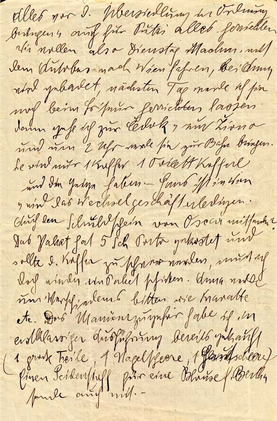 put everything in order before the move and to prepare everything for Putzi7. We want to travel on Tuesday afternoon by bus to Vienna; we will bathe at Anny’s8 and the next day. I will still make an appointment for her with the hairdresser. Then I will go to Čedok9 and to Zirno and at 2 o’clock, I’ll bring her to the train. She will only take one suitcase, a make-up case and the violin. Hans is in Vienna and will see to the business of money exchange. Should I also I send the credit note from Oskar? The package cost 5 Sch.10 duty already and should the suitcase turn out to be too heavy, I will have to send a package yet again. Anna will beg for several things, such as ties, etc. I have already bought a manicure set in first class condition (1 good file, 1 nail scissors, 1 skin scissors). I also will send silk for a blouse for Berta. [next page] |