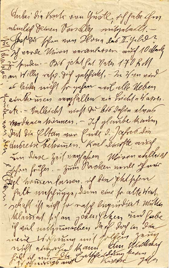 I’m enclosing the card from Gustl;11 of course, I gave him your suggestion. Do you already have the second installment of money from Ilona? I will persuade Miron12 to send 10 Marks too. Until now, father has sent 170 RM to Willy, respectively to you.13 I regret that in Vienna it will not be like that, because all additional income will disappear like light and water, etc. Perhaps you will earn something by then. I doubt that our parents will get the exit permit before the end of the year. Karl should also depart around that time. Miron, maybe earlier. I will let Sigl14 come to do the packing. I am already half crazy15, as such an old household is not so quickly liquidated. Mother clings to every scrap and so I have a lot to endure, because I can’t move into the new apartment with such junk. On Wednesday, I’ll get the decision at the housing authority. Kisses Gisa |